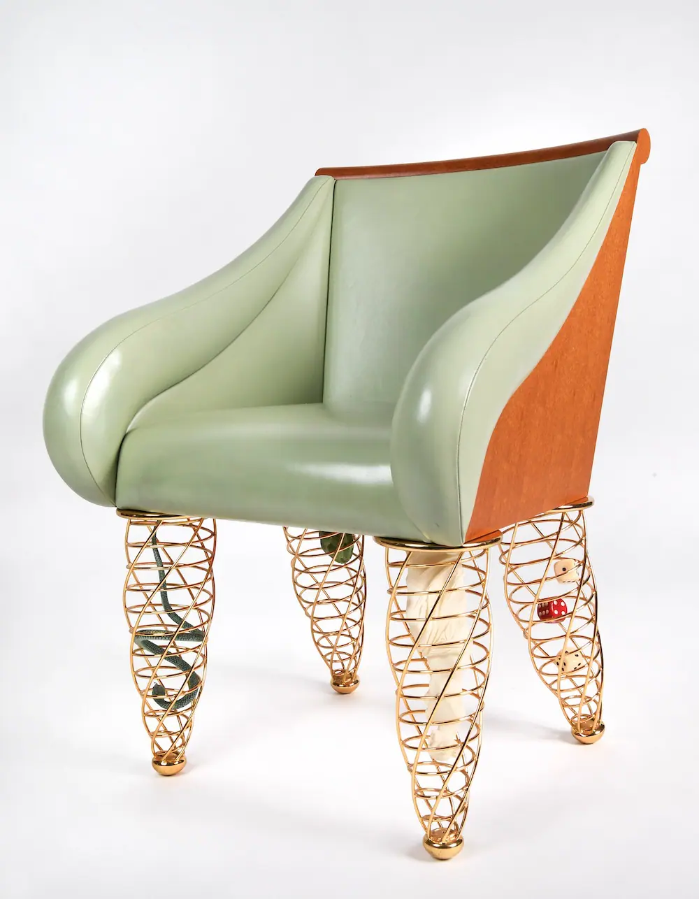 Les Gobelins abritent toujours des manufactures (les Gobelins proprement dits mais aussi Beauvais pour les tapisseries ; la Savonnerie pour les tapis). Les lissiers d’aujourd’hui tissent tapisseries et tapis d’après des cartons d’artistes contemporains. En descendant l’escalier conduisant vers la sortie, vous verrez une page géante d’éphéméride en date du 14 juillet 1976 : c’est une tapisserie ! L’excellence du geste artisanal est au service de la création contemporaine, pas uniquement de la restauration d’œuvres anciennes. En témoigne un fauteuil réalisé au sein de l’atelier de recherche et de création du Mobilier national sur une idée – un design – de Sylvain Dubuisson pour le bureau des Jack Lang au ministère de la Culture. C’est un siège classique garni de cuir amande aux étranges pieds d’acier renfermant un artichaut, trois dés, une vénus de Milo à l’envers et un serpent ! Entre trône napoléonien, fauteuil de magistrat et fauteuil conçu pour la tribune présidentielle du 14 juillet, l’exposition rappelle que le siège est souvent un attribut du pouvoir.