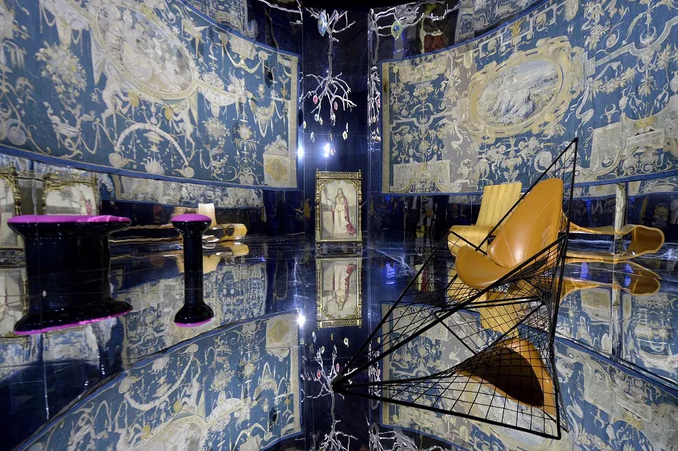 Derrière l’escalier, un petit film et quelques pièces à manipuler aident à comprendre les différentes étapes de la conception d’un siège. À mi-parcours, dans une pièce à part, carte blanche a été laissée au scénographe de l’exposition, Jacques Garcia, célèbre architecte d’intérieur, propriétaire et décorateur du château de Champ de Bataille dans l’Eure. L’ambiance est mystérieuse, nos repères dans le temps et l’espace, envolés. Sol, plafond et murs sont recouverts de miroirs, démultipliant l’espace. Un arbre pousse à l’envers mais est reflété à l’endroit, deux tapisseries Renaissance (XVIe siècle) sont associées à des meubles contemporains, eux aussi réfléchis dans le sol.