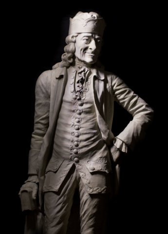 Mme Necker, qui anime un brillant salon à Paris, lance une souscription pour réaliser une statue du philosophe ; la tâche est confiée à Jean-Baptiste Pigalle. Si Voltaire est ravi à l’idée d’être statufié, il préfèrerait une représentation idéalisée, dans la force de l’âge. Or, le sculpteur est dépêché à Ferney afin de le portraiturer le plus fidèlement possible. Il envisage même de le figurer drapé à l’antique, donc en partie nu. Mes yeux sont enfoncés de trois pouces, mes joues sont du vieux parchemin […] Le peu de dents que j’avais est parti, écrit le vieil homme dubitatif à Mme Necker. Il redoutait les sarcasmes, à raison.