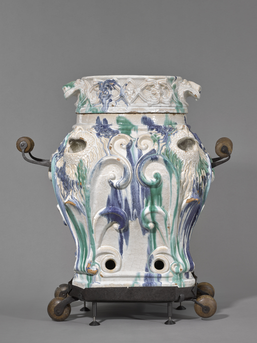 Petit poêle à braise, faïence, poignées et roulettes en bois, métal © Benjamin Gavaudo/ CMN