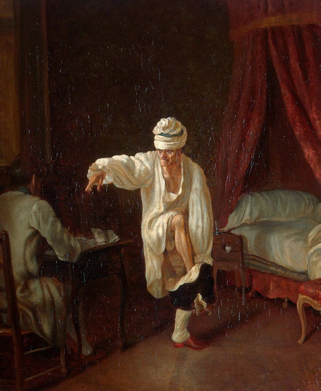 Patricien genevois pratiquant les arts en amateur, Jean Huber s’était fait une spécialité de représenter Voltaire dans son quotidien, ici en bienveillant seigneur de Ferney. C'est ainsi qu’il m'a rendu ridicule d'un bout de l'Europe à l'autre, déplorait Voltaire dans une lettre à Mme du Deffand.