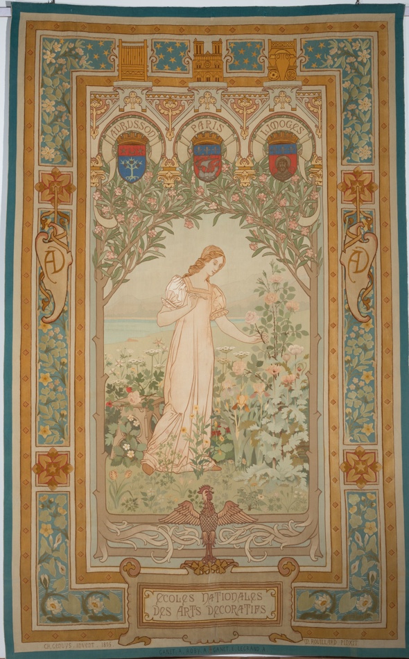 Cette œuvre est caractéristique de l’art nouveau des années 1900. De la chevelure de la jeune femme, aux feuillages en passant par l’encadrement : tout n’y est que courbes et entrelacs. En ajoutant au tissage traditionnel de la tapisserie une bordure tissée en point noué, technique habituellement réservée au tapis de sol, cette œuvre témoigne du renouveau de la tapisserie d’Aubusson dès la fin du 19e siècle sous la houlette de l’ENAD – école nationale des arts décoratifs. On a parfois tendance à attribuer ce renouveau exclusivement au peintre Jean Lurçat. Or, s’il a joué un rôle indéniable dans l’essor des commandes et la modernisation des cartons, Lurçat n’a entamé sa collaboration avec Aubusson qu’en 1937.