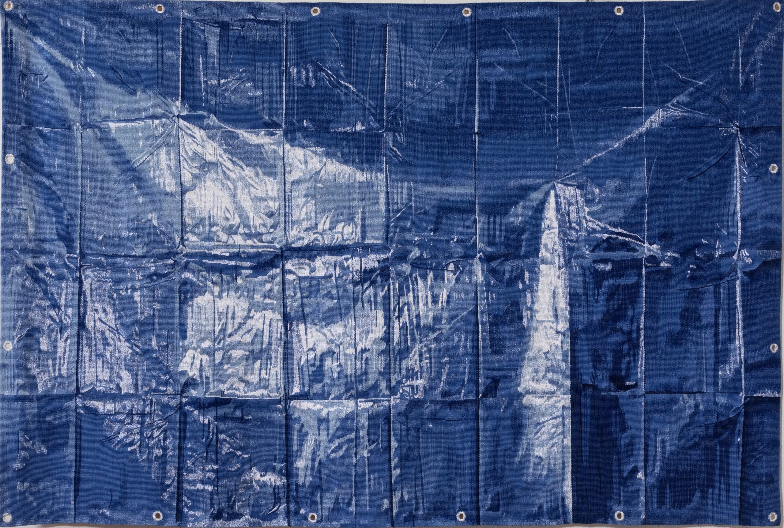 « Bleue » transpose en tapisserie une bâche plastique longtemps pliée et qui viendrait d’être dépliée. Reflet de la lumière sur le plastique, pliures marquées : de loin l’illusion est parfaite. En se rapprochant, le spectateur constate que c’est une œuvre tissée, parfaitement plate et mate.