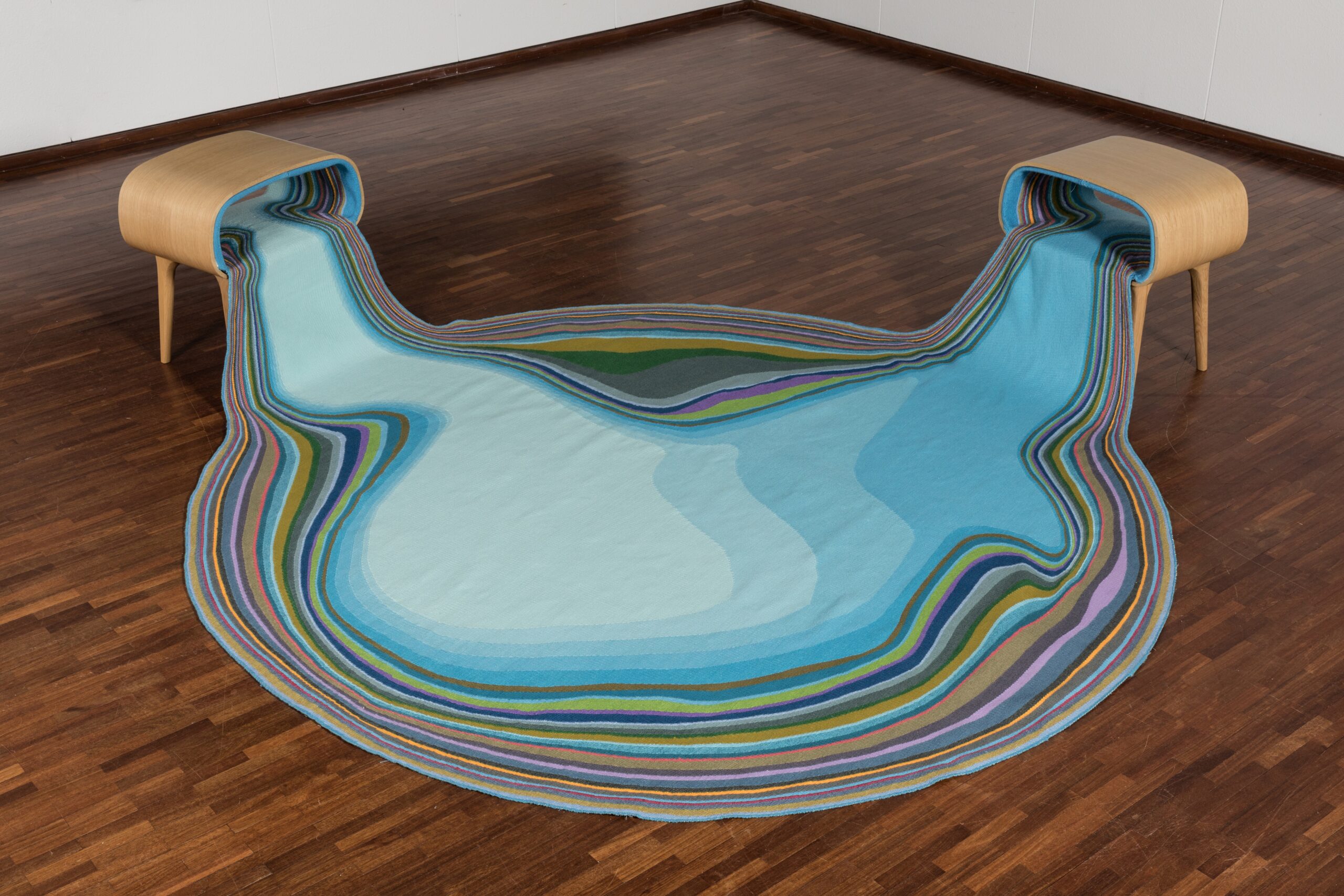 La Nef des tentures qui, dans une mise en scène théâtrale, présente des tapisseries et tapis réalisés du Moyen Âge au 20e siècle, invite les artistes contemporains à se familiariser avec l’histoire et les techniques de la tapisserie d’Aubusson. Pour concevoir « Confluentia » – un lac tissé s’étendant entre deux meubles –, l’architecte designer Bina Baitel s’est inspirée des couleurs verdures tissées à Aubusson aux 17e et 18e siècles, ainsi que de la manière dont les liciers d’alors interprétaient l’eau en juxtaposant des bandes de couleurs.