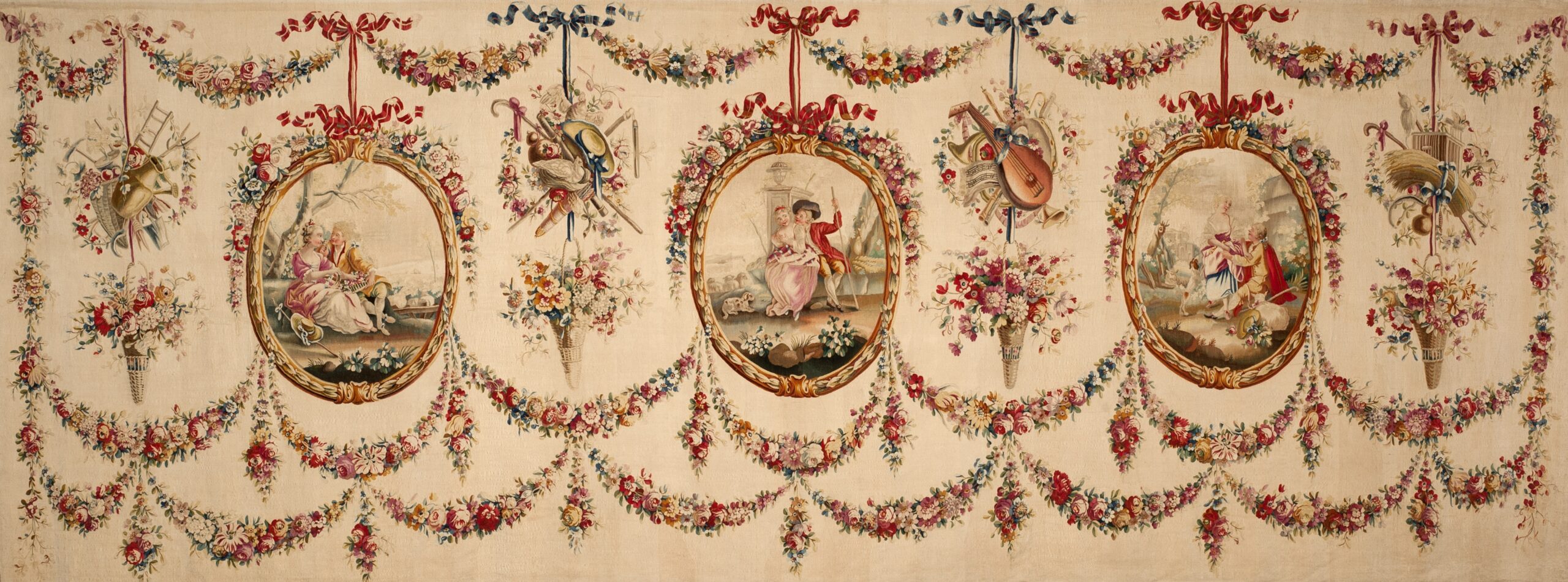Tapisserie à alentours abritant trois médaillons illustrés de scènes galantes, seconde moitié du 18e siècle, atelier d’Aubusson, collection de la Cité de la tapisserie d’Aubusson © Éric Roger