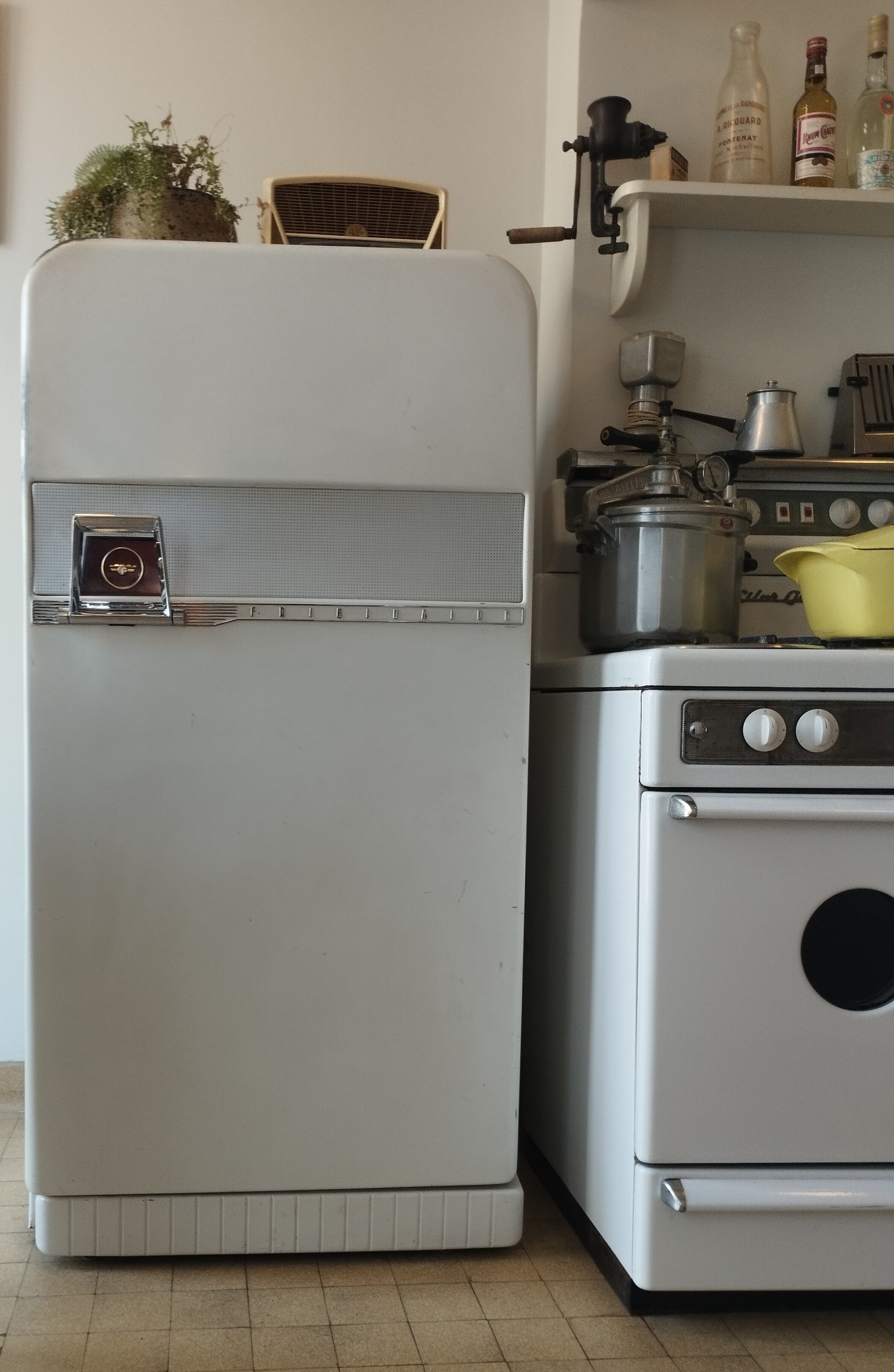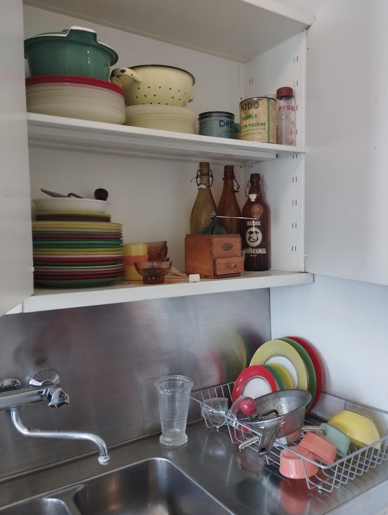 L’électroménager entend alléger la vie domestique qui assujettit la femme – on ne parle pas encore de partage des tâches ! La cuisine est pensée rationnellement. Placards hauts et placards bas, les ustensiles et la vaisselle sont à portée de main.