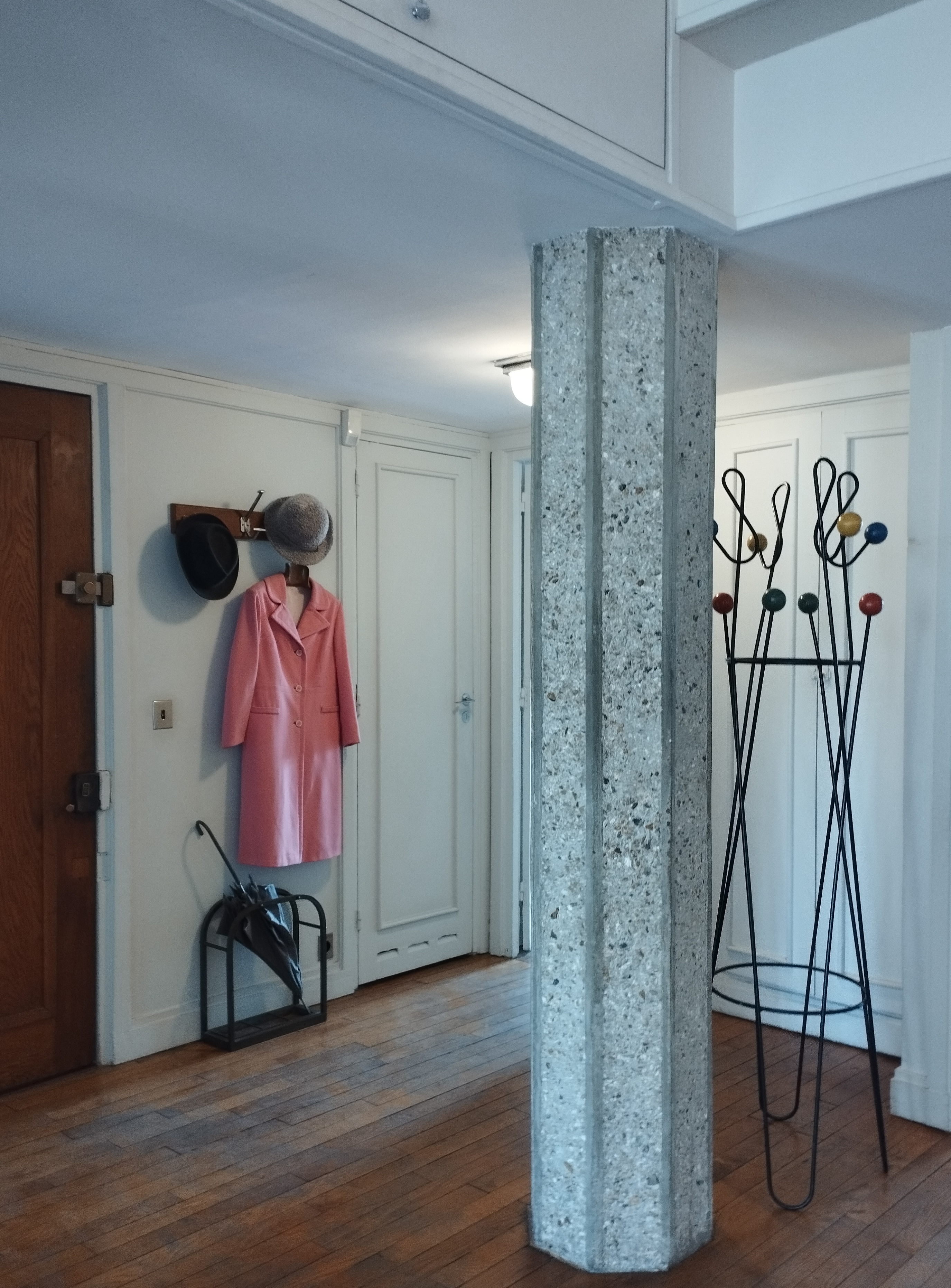 Dès la porte d’entrée franchie, le visiteur fait face à une colonne, inattendue à cet emplacement. C’est la seule structure porteuse à l’intérieur de l’appartement.