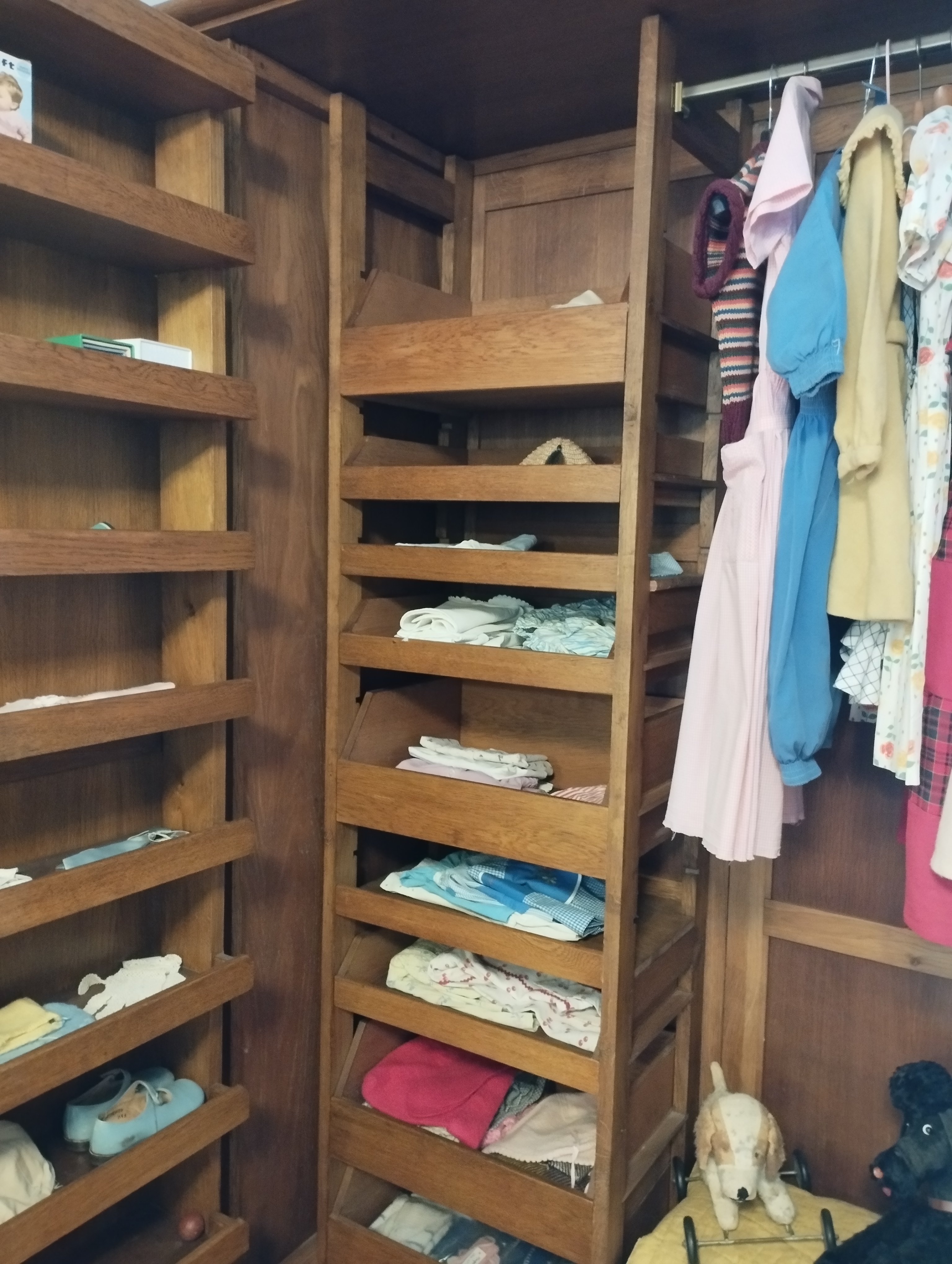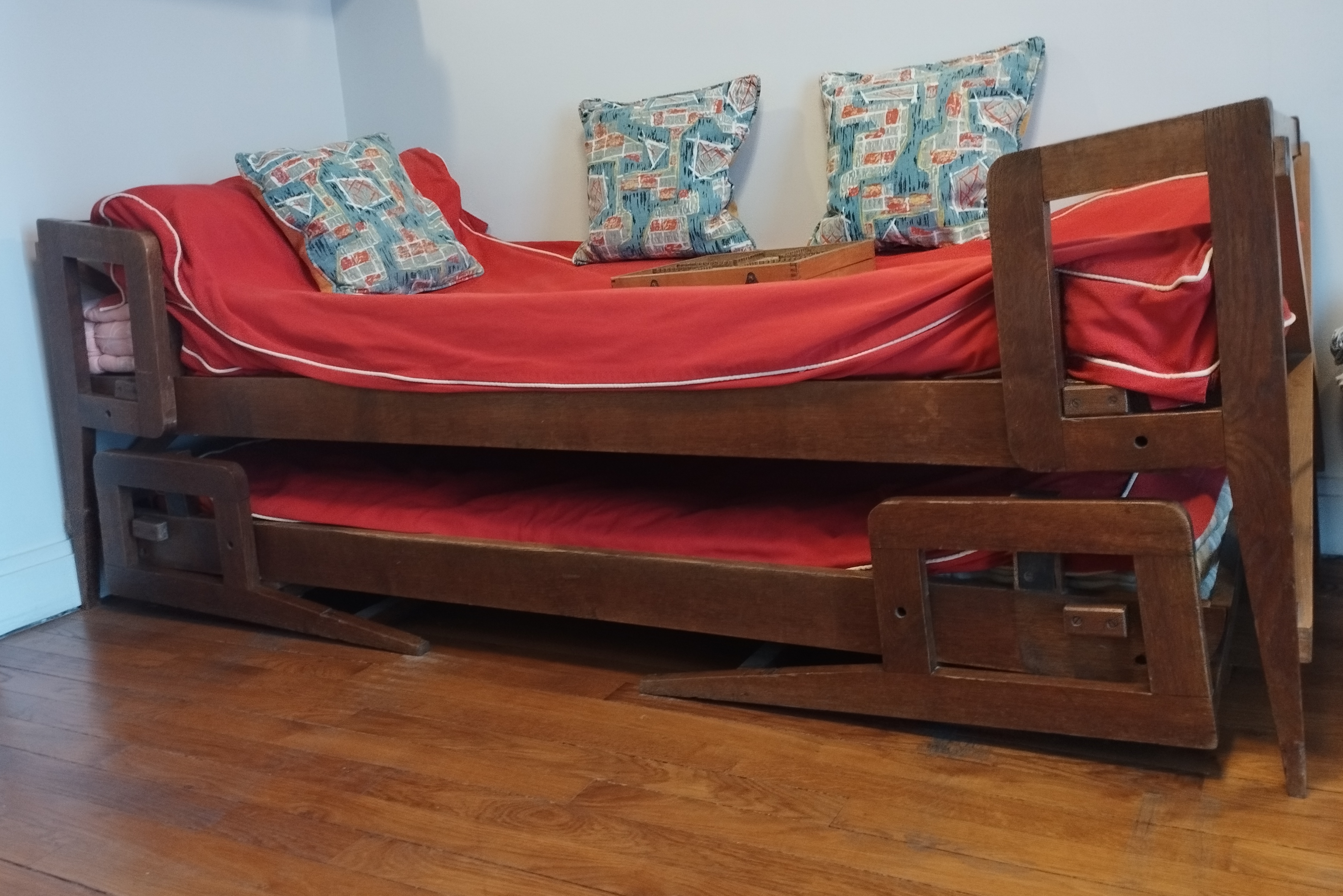 Ce lit en surmonte un autre qui, en cas de besoin, peut se glisser vers l’extérieur et même s’élever au niveau du premier si on retourne ses pieds – que l’on voit ici repliés.