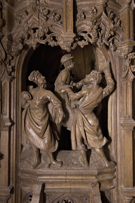 L’inspiration flamande se retrouve dans les stalles – silhouettes élancées, en torsion, gestes véhéments, vêtements aux forts effets décoratifs.
